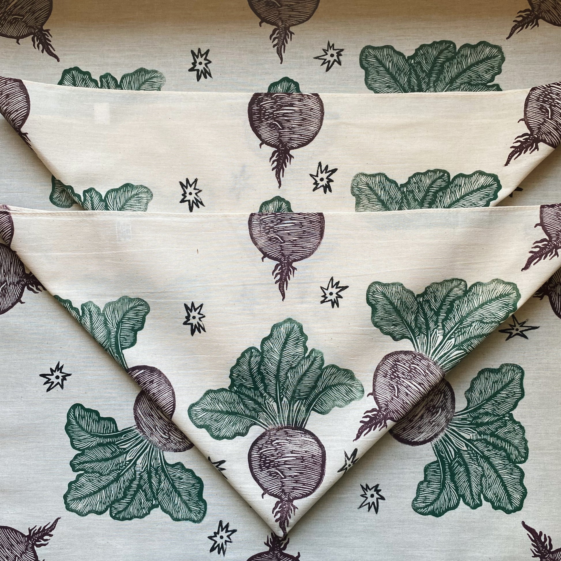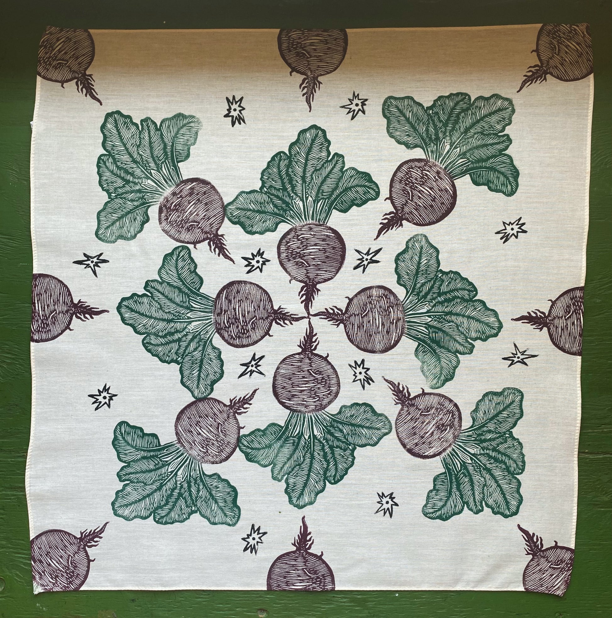 Designed, carved, and hand printed 100% cotton handkerchief. This design is achieved using hand carved blocks and is printed using dark green, deep purple, and black oil-based non-toxic block printing fabric ink.