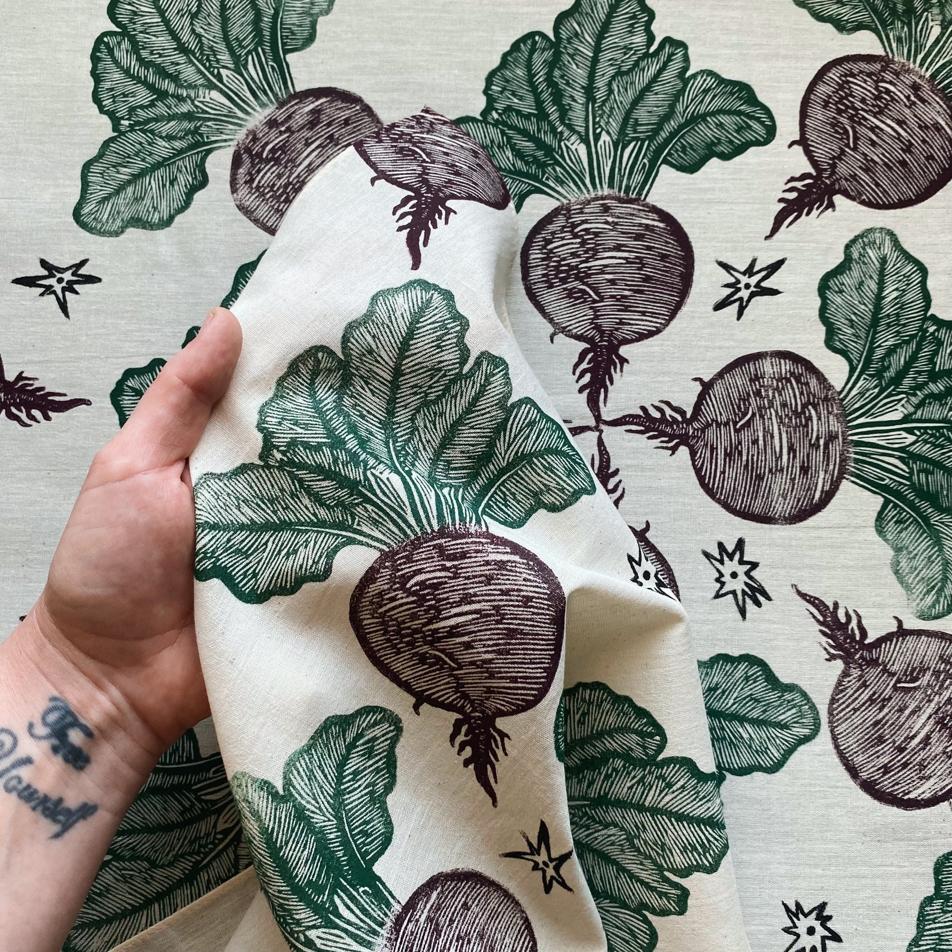 Hand printed textiles are machine washable but are more delicate than machine printed pieces. I recommend washing sparingly using cold water and dry on low. When cared for properly these pieces will last for many years. Do expect ink to soften and some pigment will wash out during the first wash. Each piece is unique and individually printed by hand in my home studio. You can expect small variations in inking and pattern orientation.