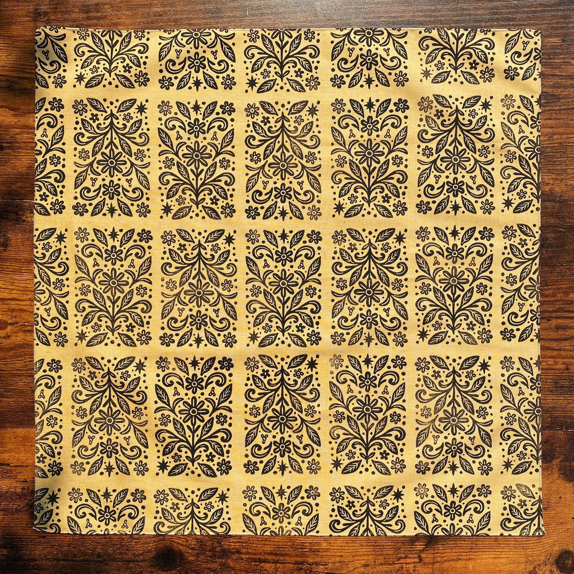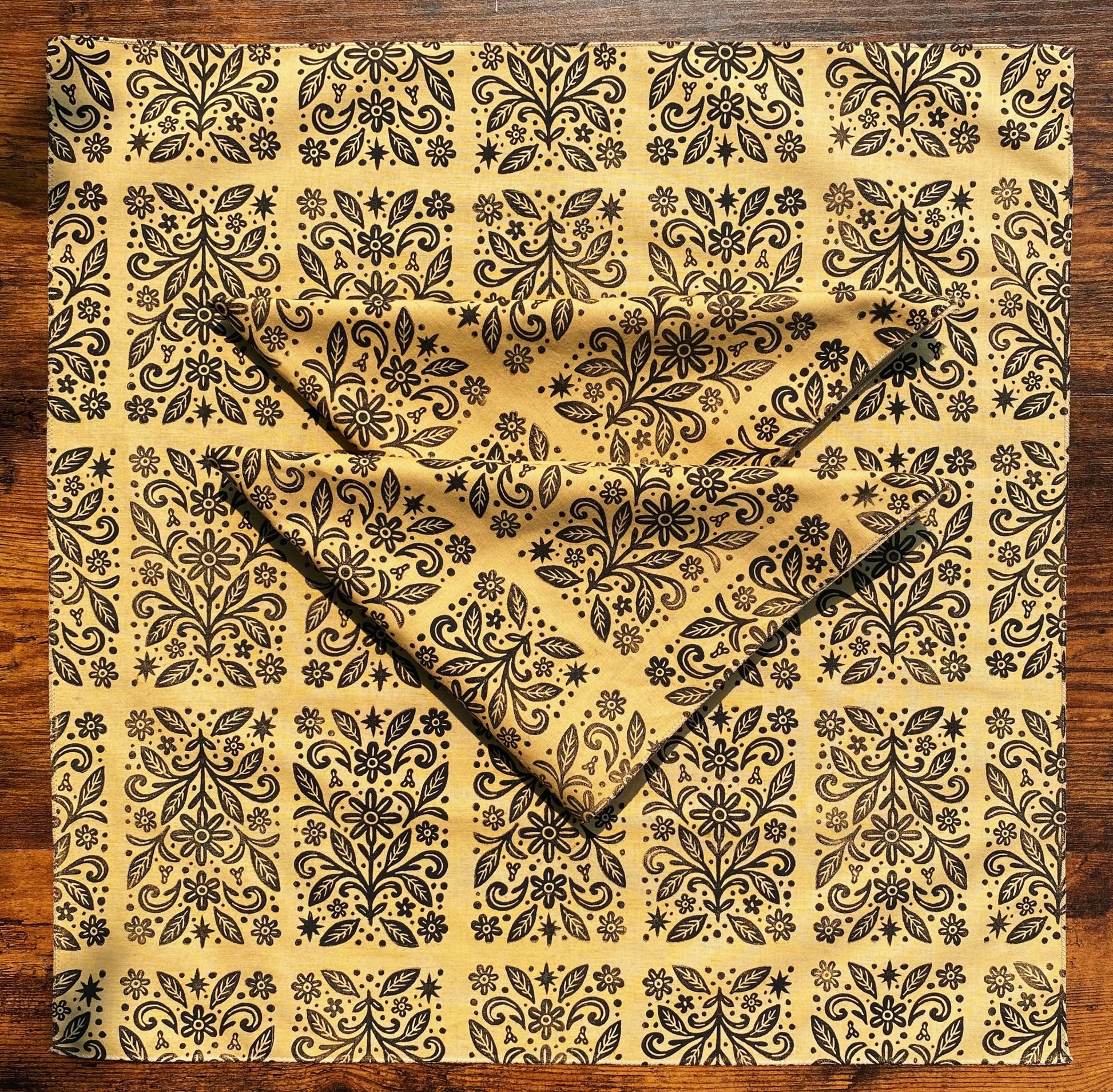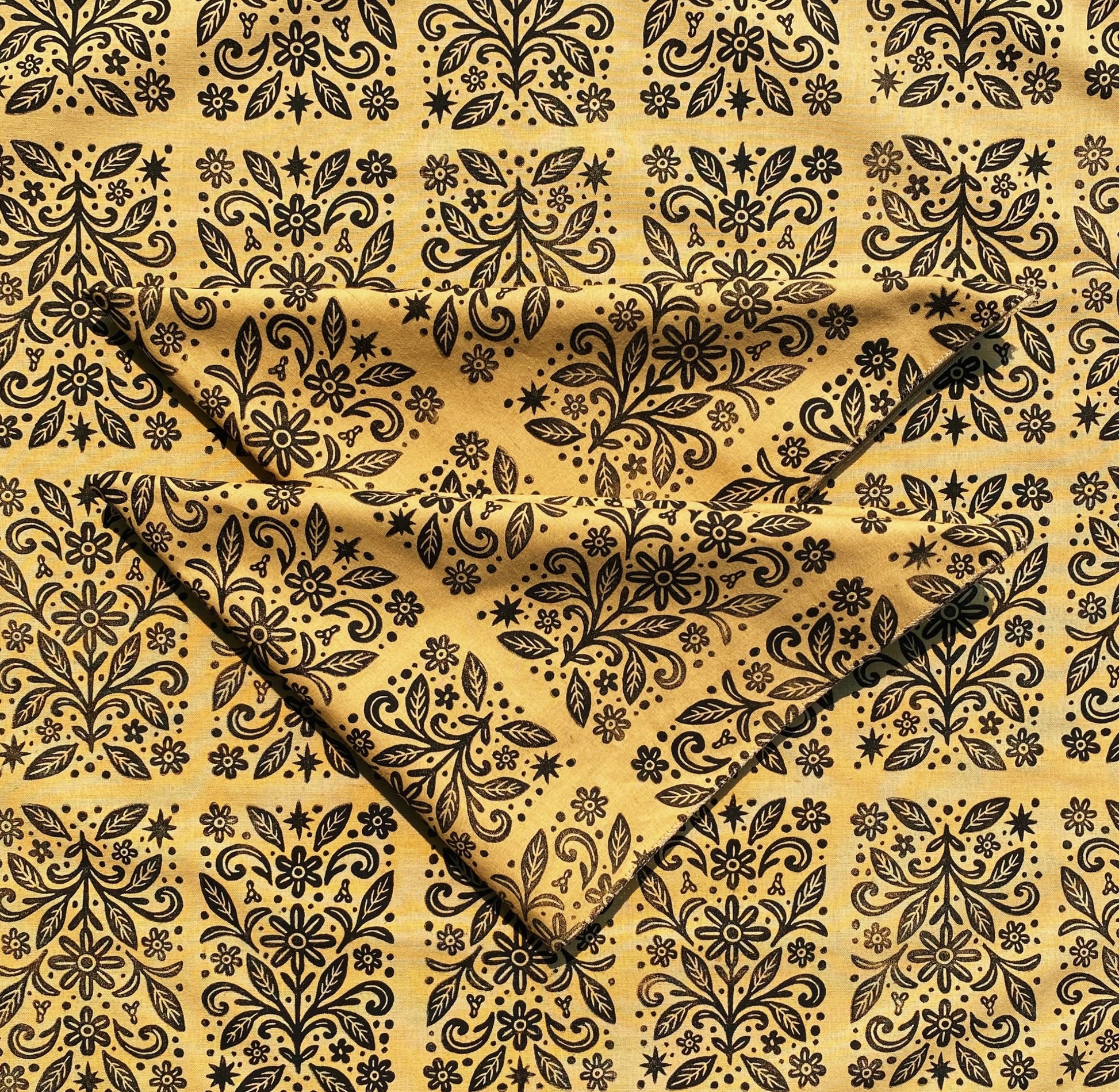 Designed, carved, and hand printed 100% golden tan cotton handkerchief. This design is achieved using hand carved blocks and is printed using black oil-based non-toxic block printing fabric ink.