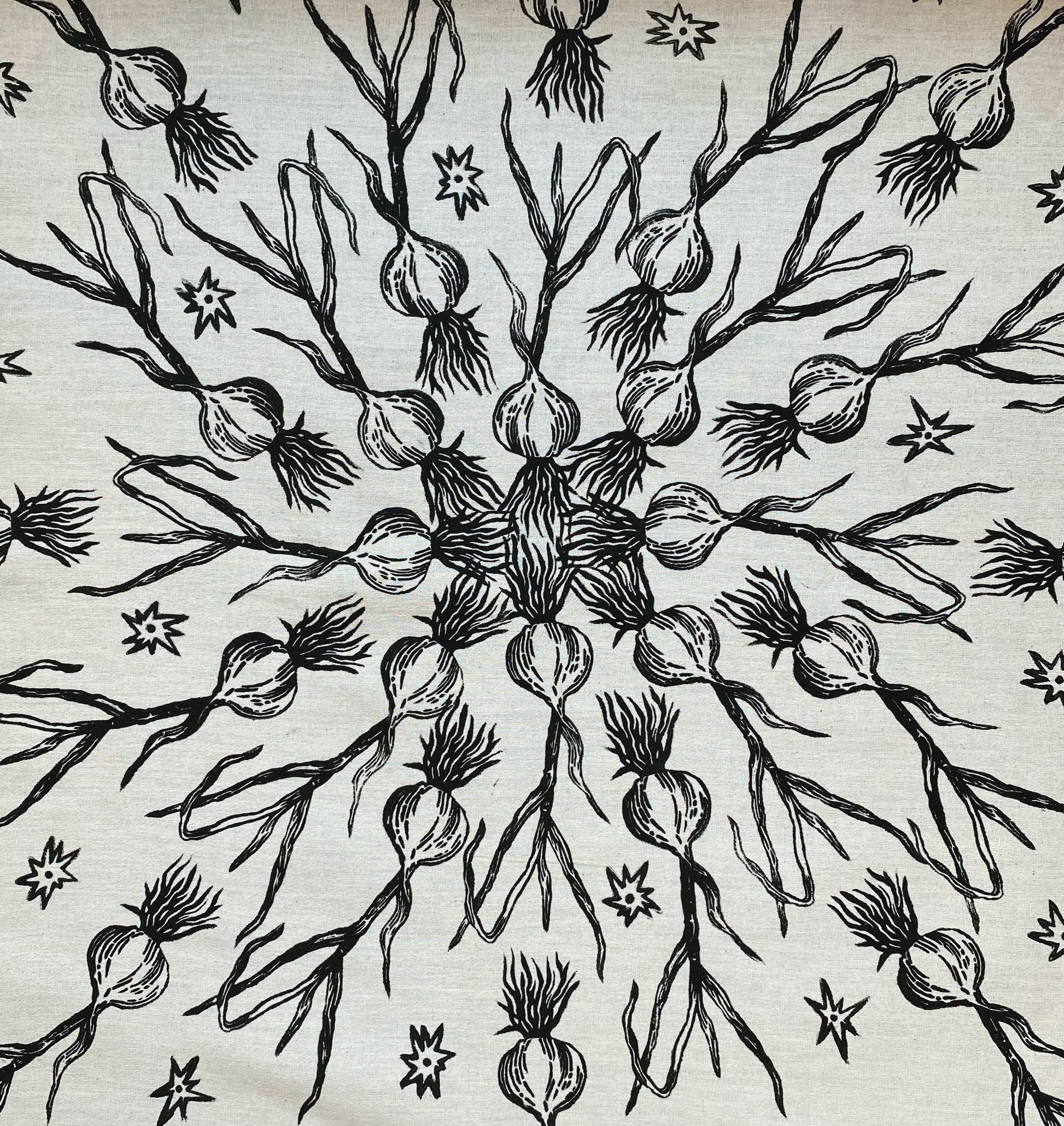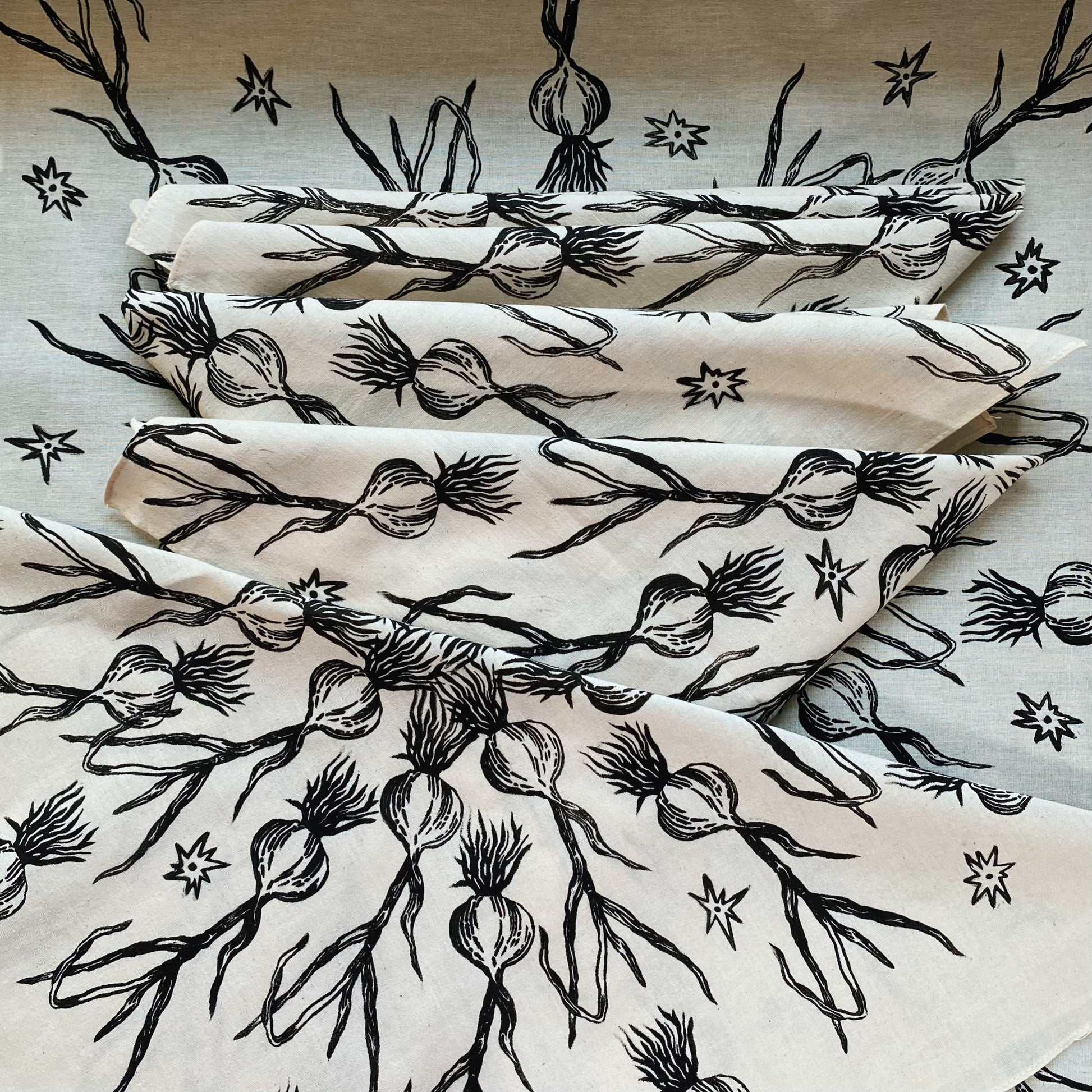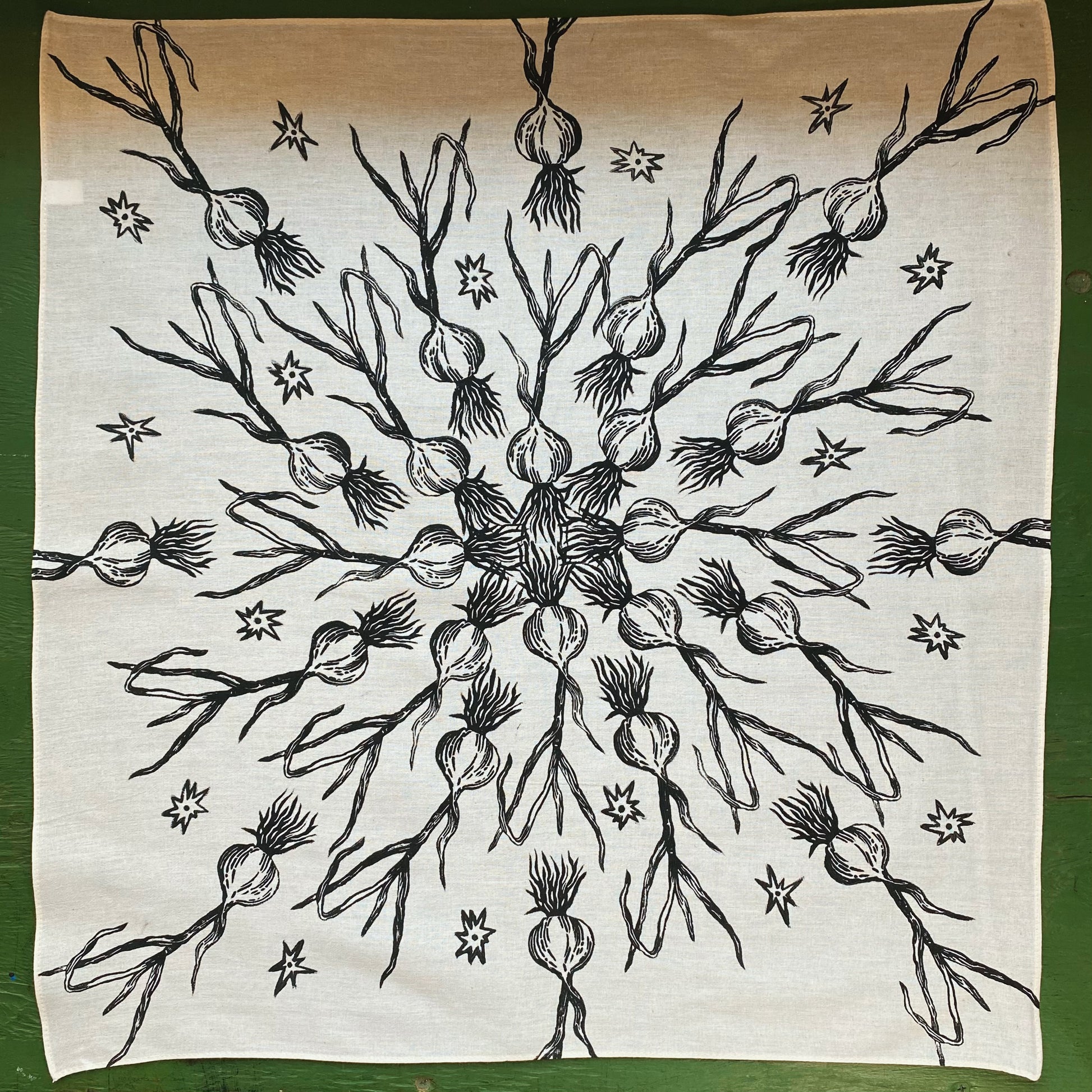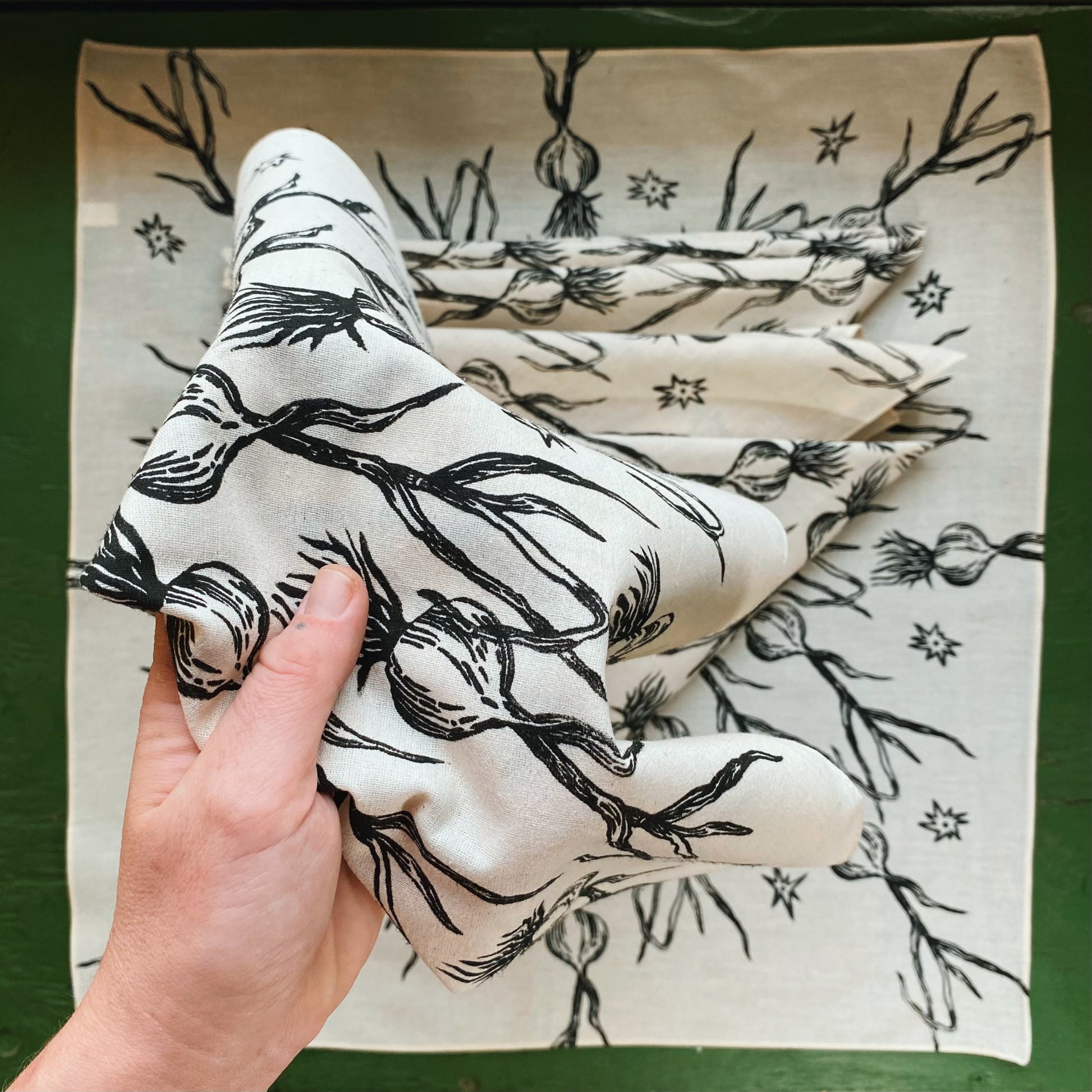 Designed, carved, and hand printed 100% cotton handkerchief. This design is achieved using hand carved blocks and is printed using black oil-based non-toxic block printing fabric ink.