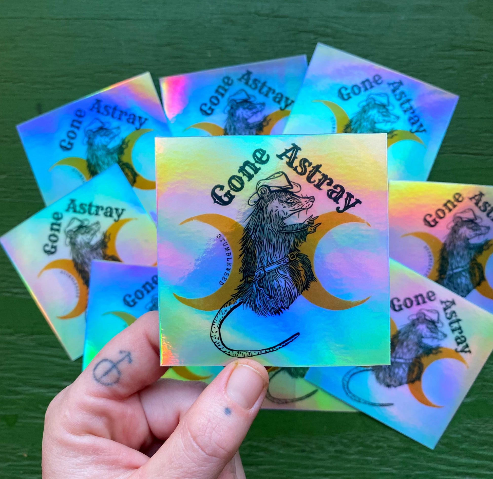 Gone Astray Cowboy Opossum Lino Print Holographic Vinyl Sticker