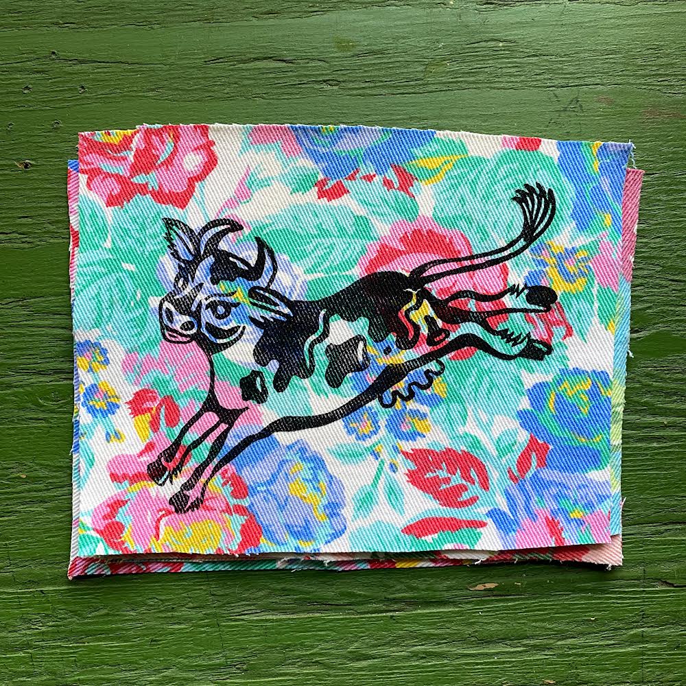 Original hand-carved lino print design handprinted using black oil-based fabric ink on upcycled floral denim fabric