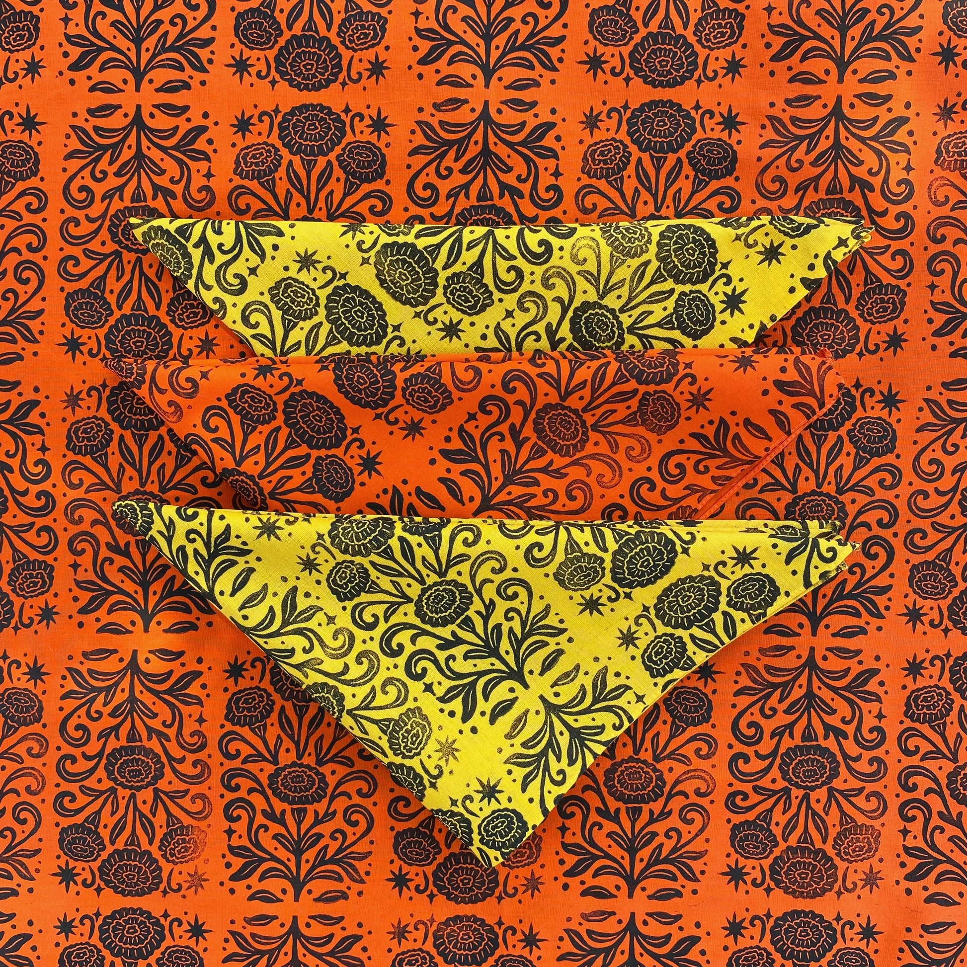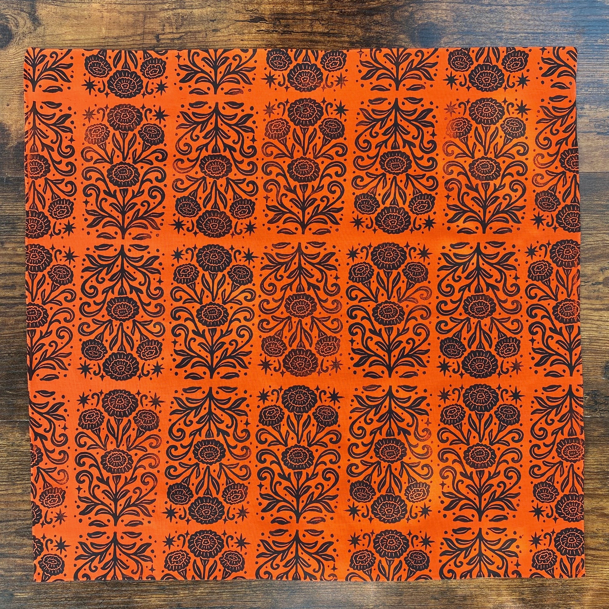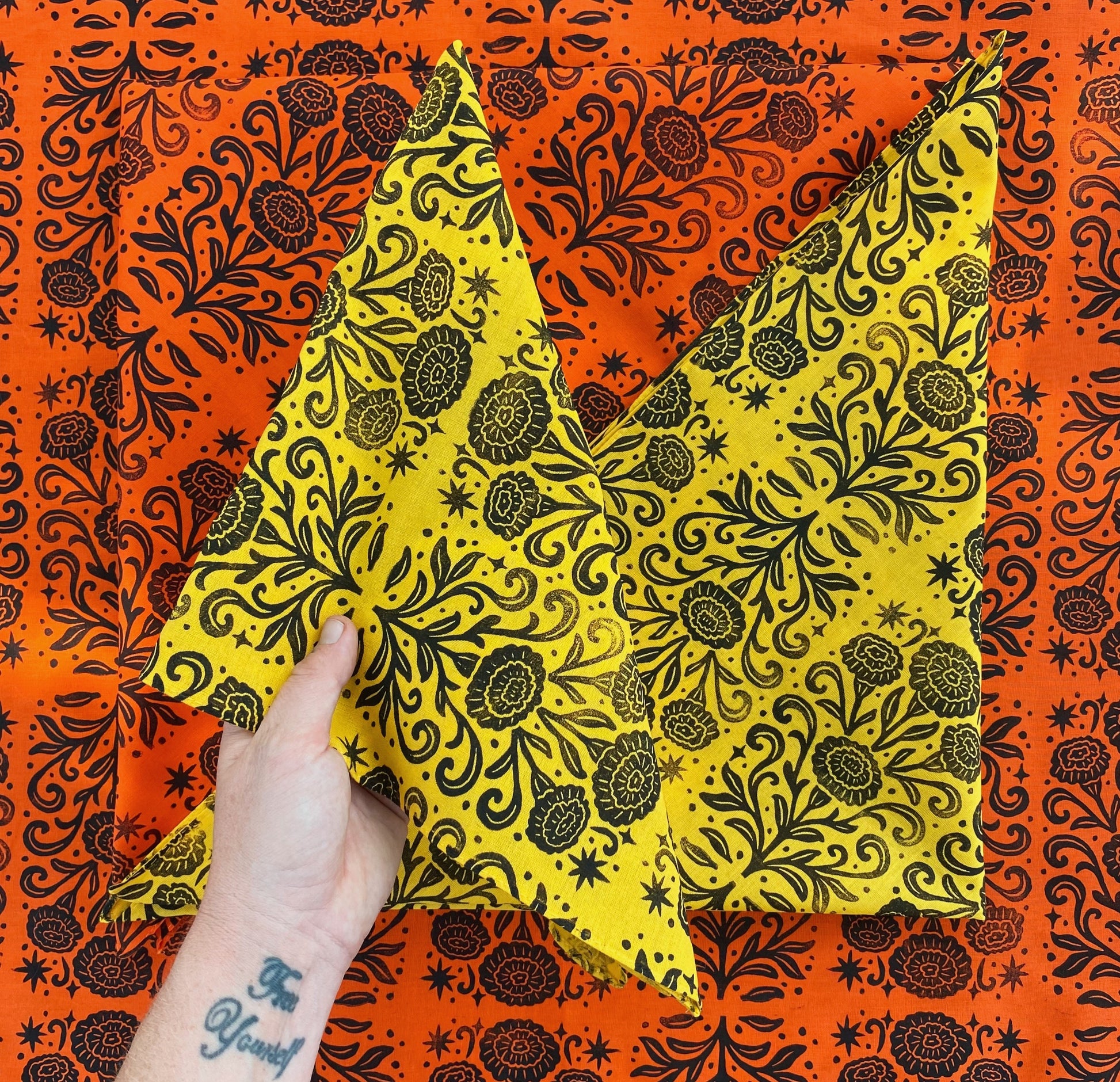 Designed, carved, and hand printed 100% orange or golden yellow cotton handkerchief. This Marigold design is achieved using hand carved blocks and is printed using black oil-based non-toxic block printing fabric ink.