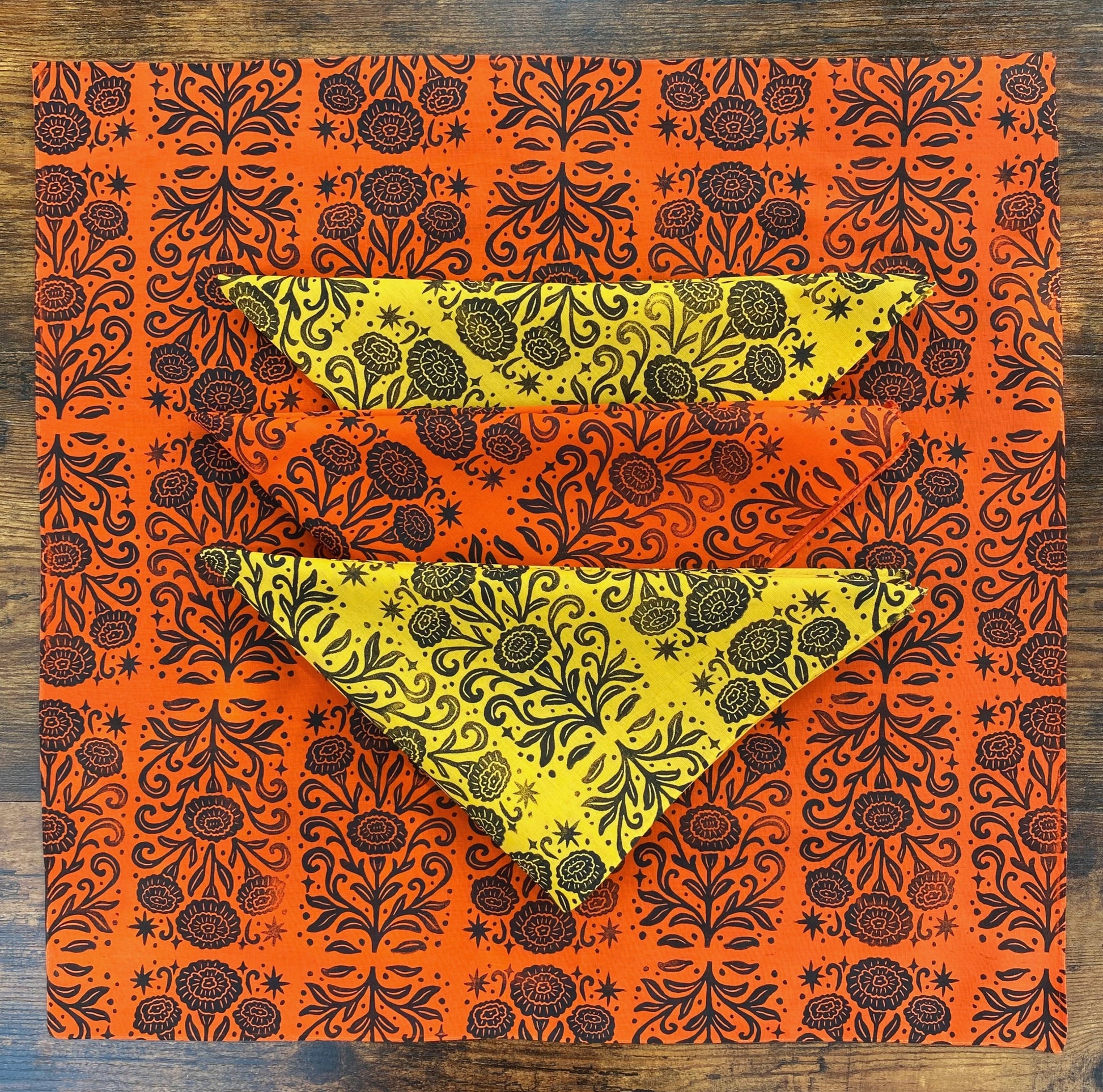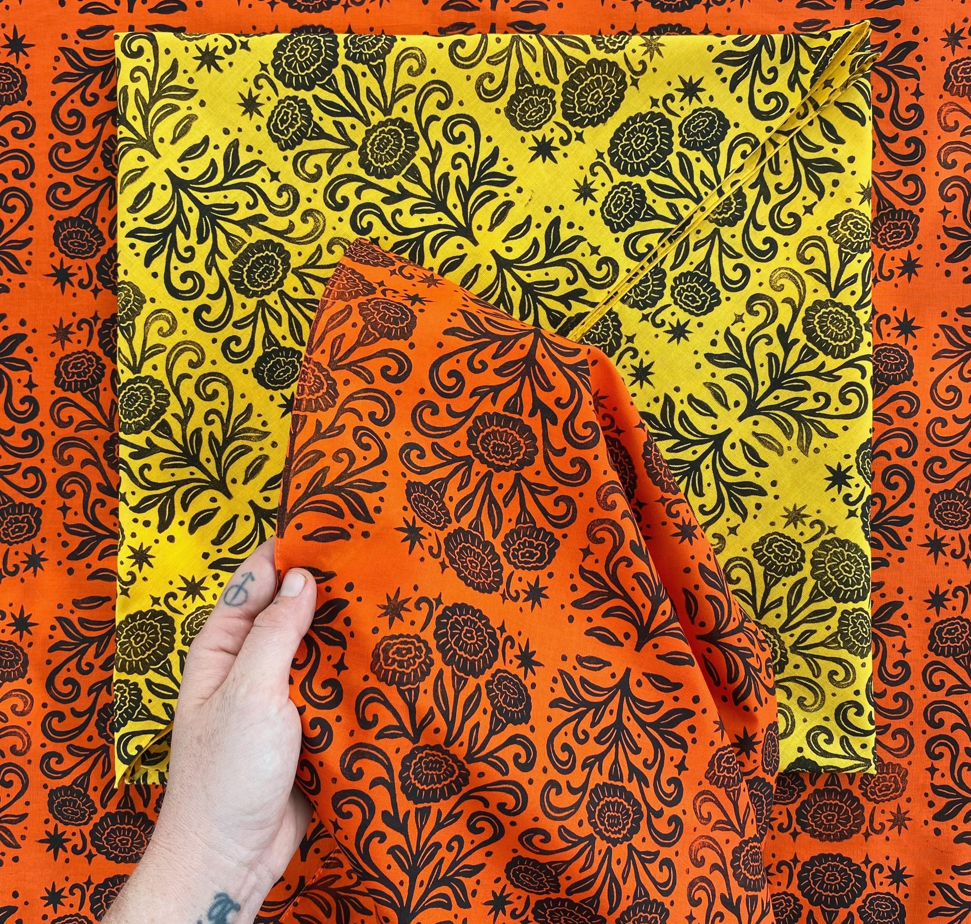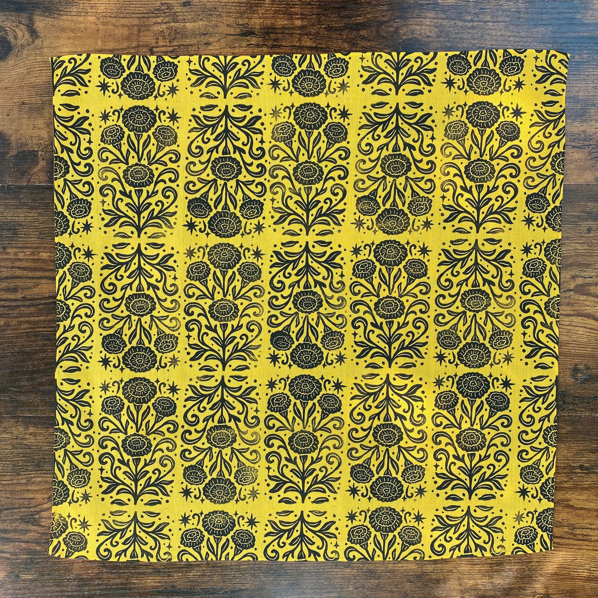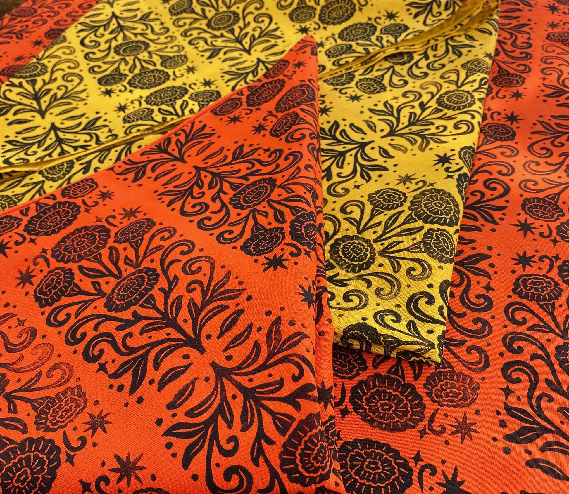 Designed, carved, and hand printed 100% orange or golden yellow cotton handkerchief. This Marigold design is achieved using hand carved blocks and is printed using black oil-based non-toxic block printing fabric ink.