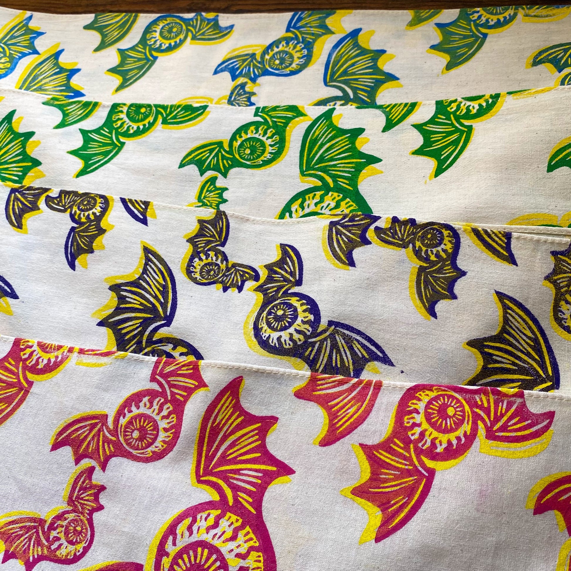 Bold, bright, and a lil bit eerie, the Night Watcher bandana is designed, carved, and handprinted on 100% natural cotton in my Detroit studio. Each bandana is hand printed twice in layered colors for that electric fuzzy, double vision vibe and available in a variety of colors! If you don't see your favorite color, send me a message or email!