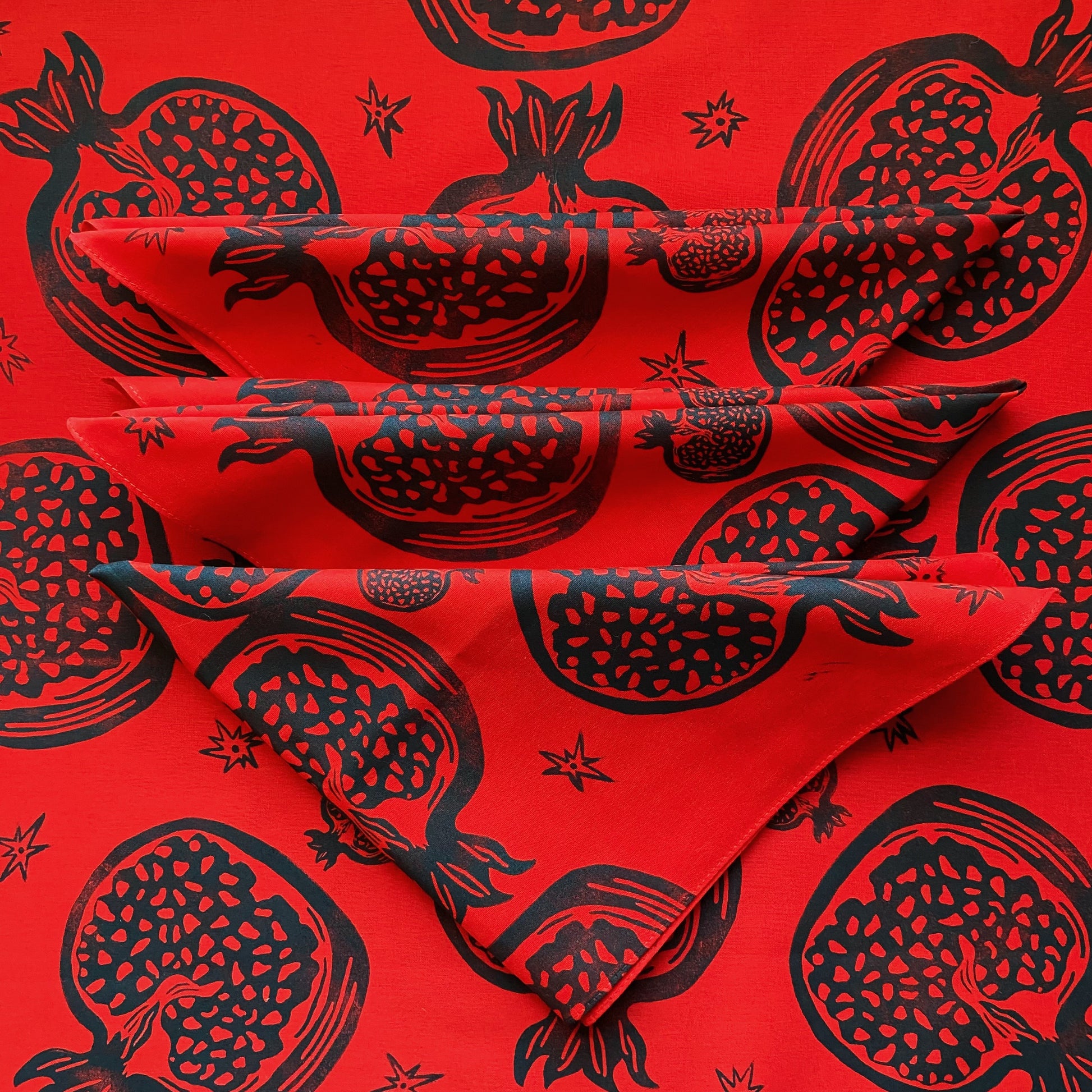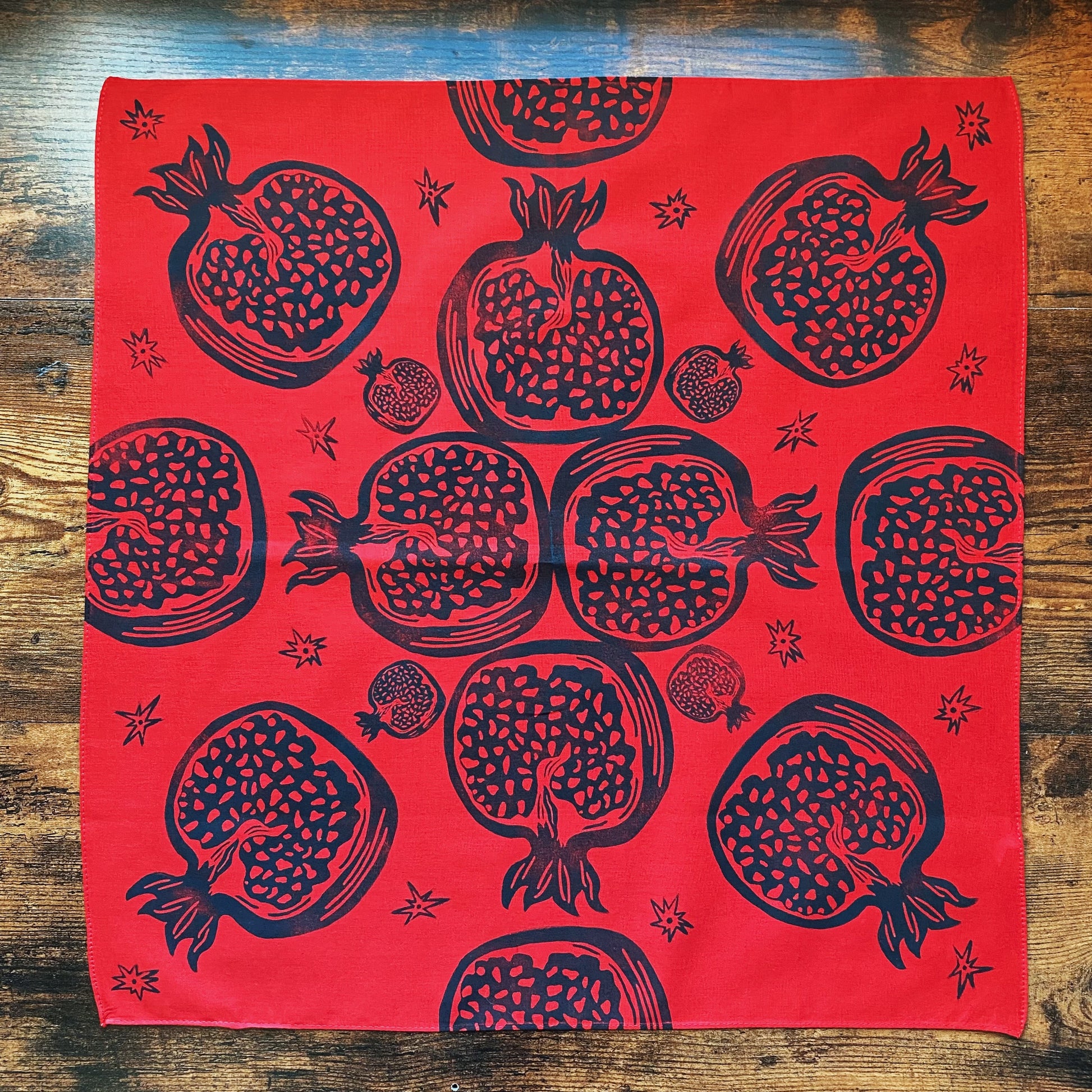 Designed, carved, and hand printed red 100% cotton bandana. This design is achieved using a hand carved block and is printed using black oil-based non-toxic block printing fabric ink.