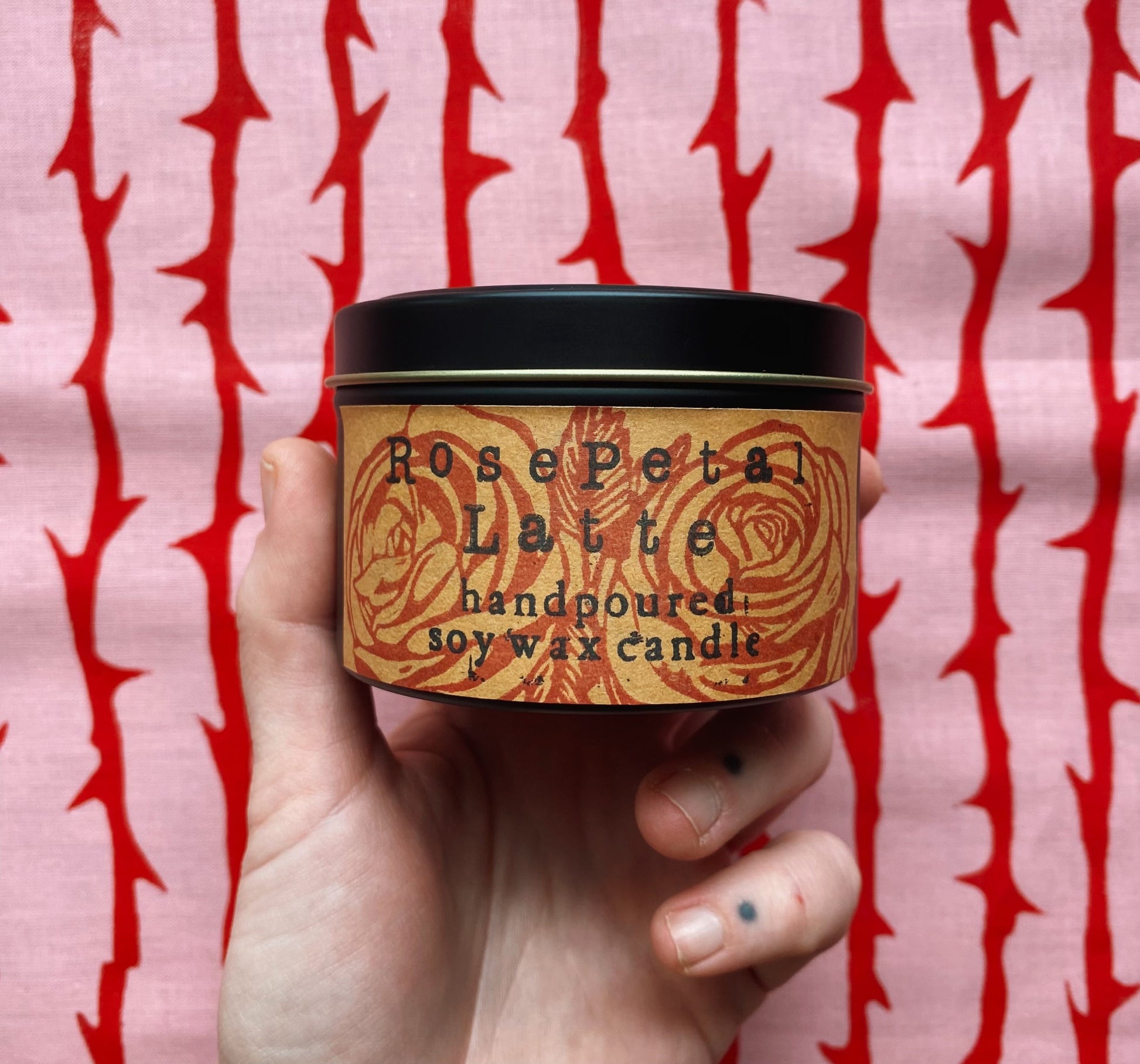 Soy candles hand poured seasonally in small batches. Adorned with lino print...