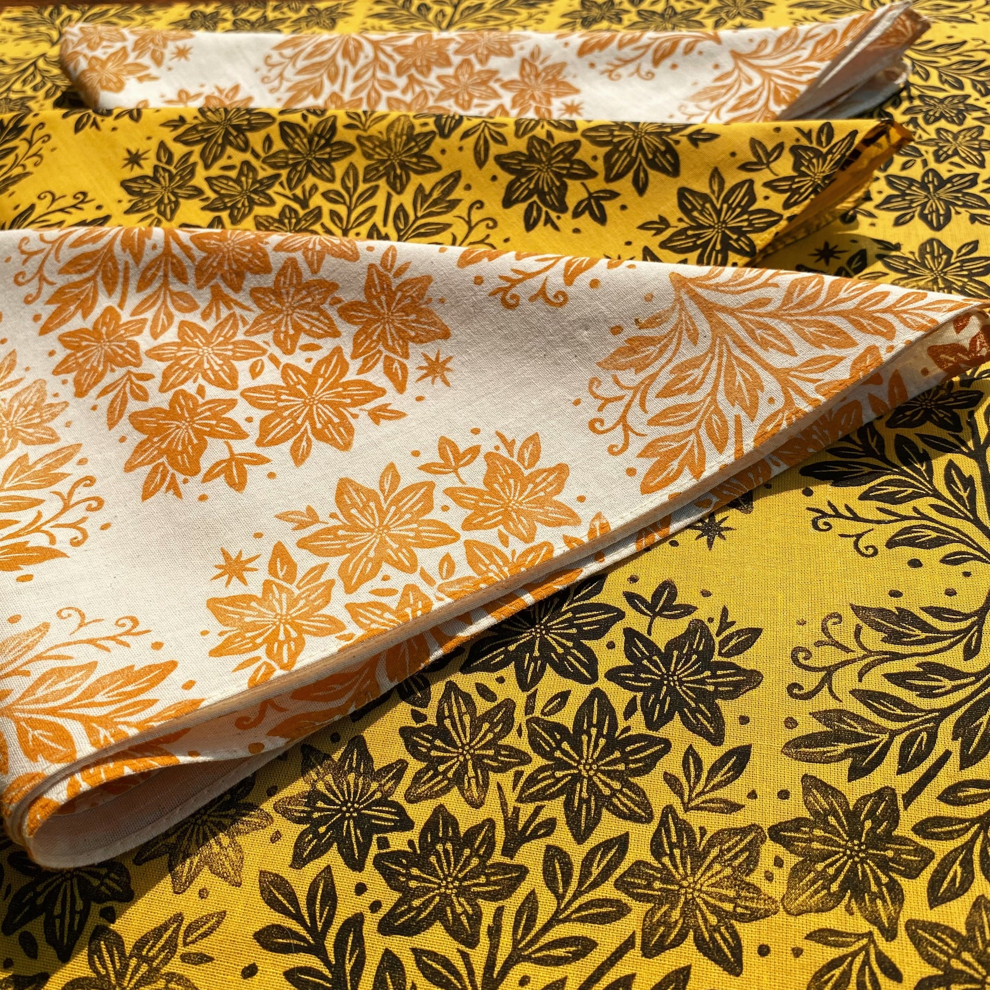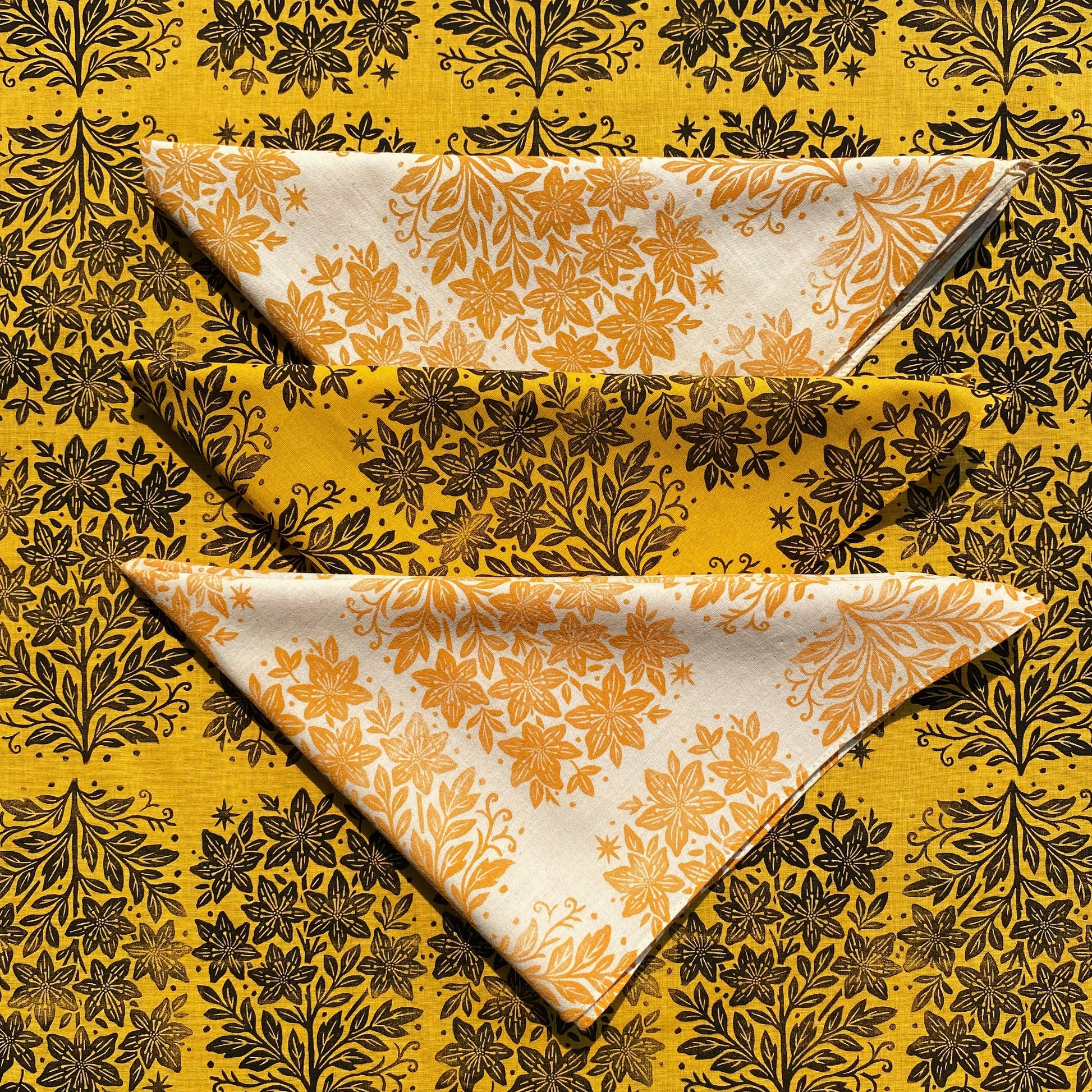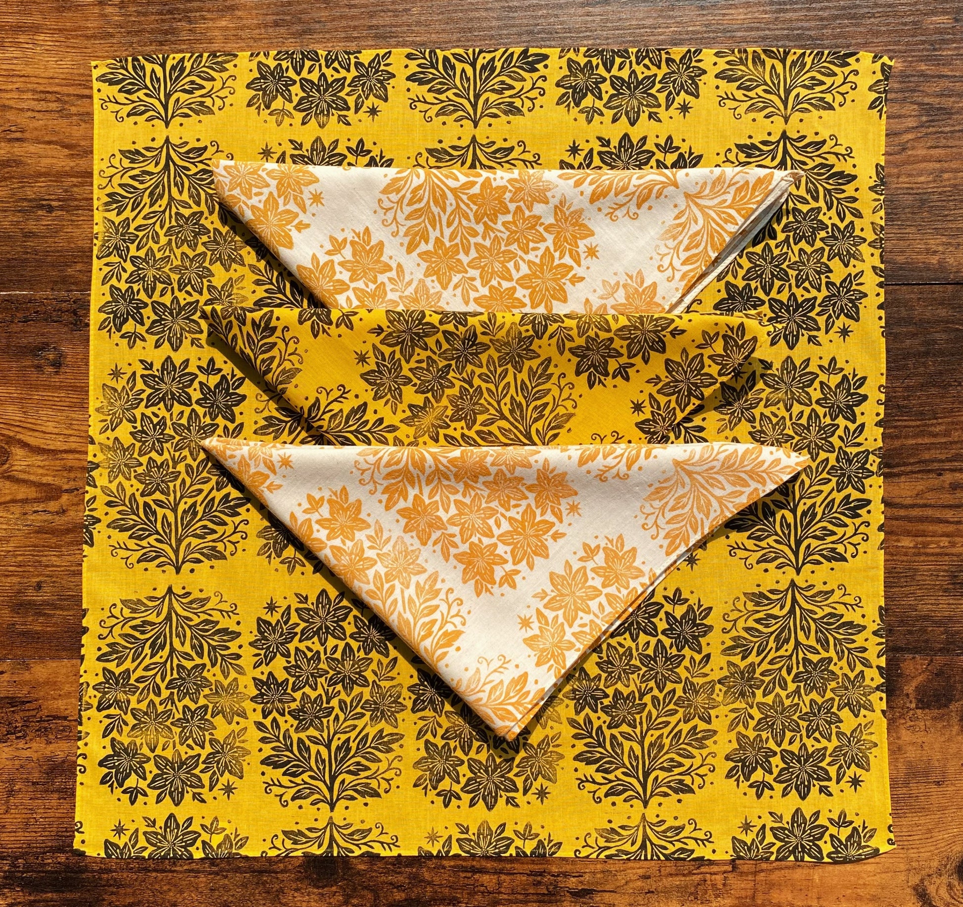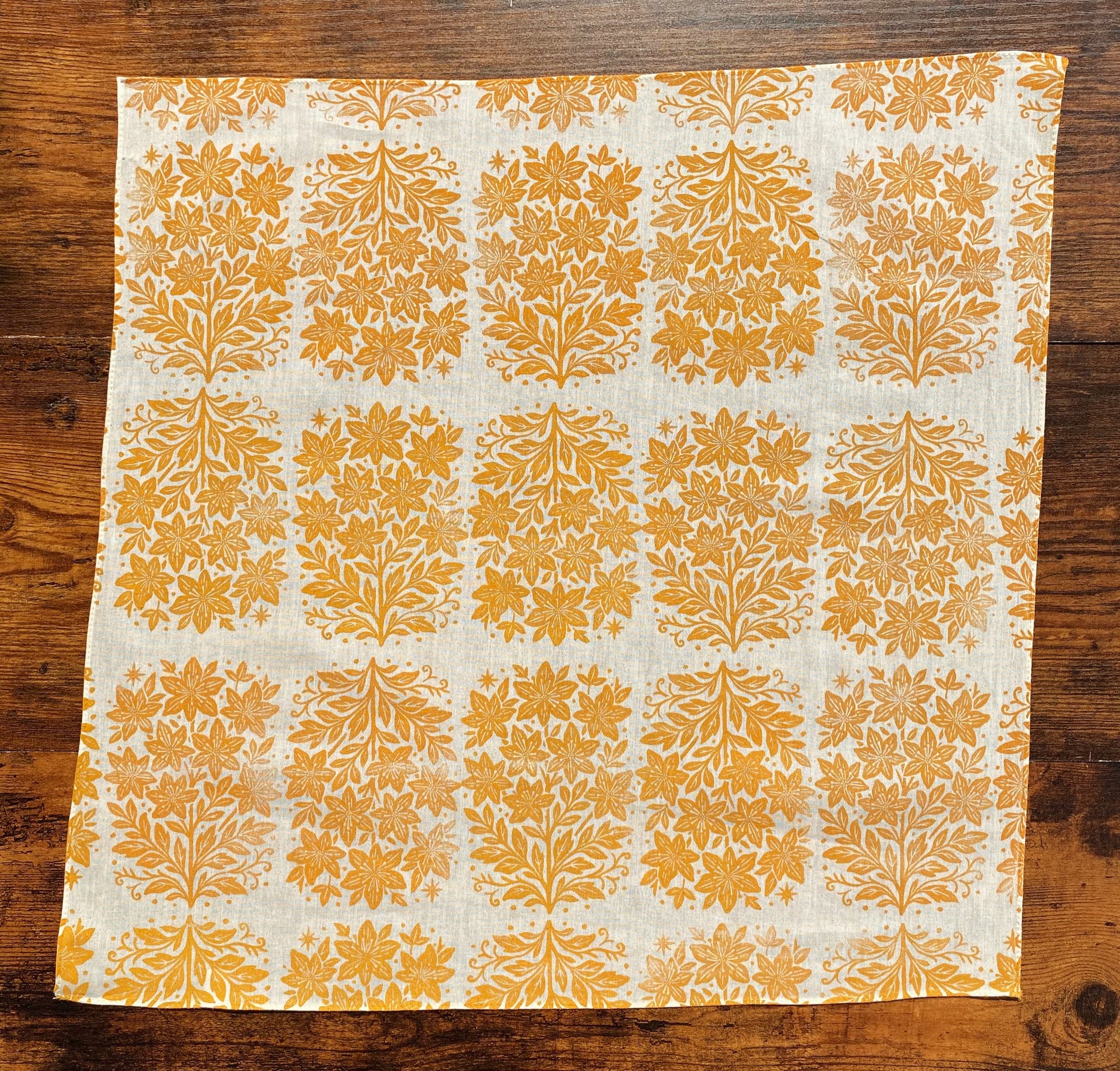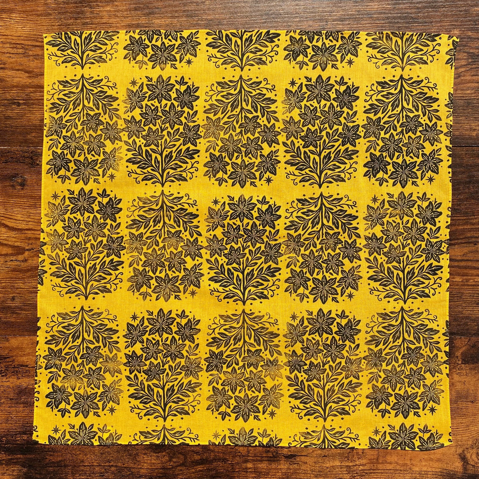 Designed, carved, and hand printed 100% natural white or golden yellow cotton handkerchief. This design is achieved using hand carved blocks and is printed using sunny deep yellow or black oil-based non-toxic block printing fabric ink.