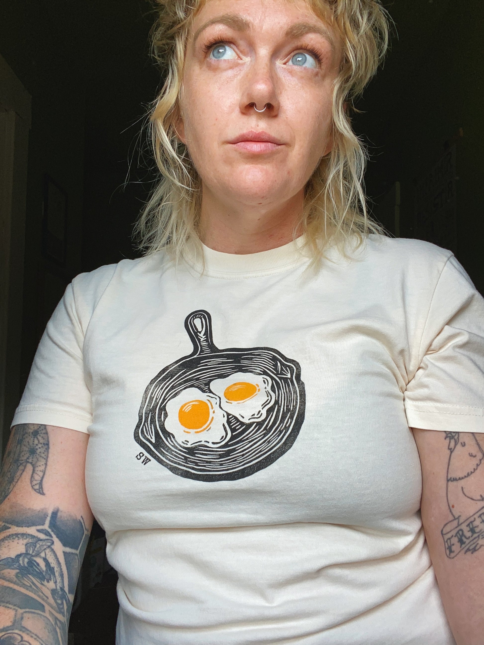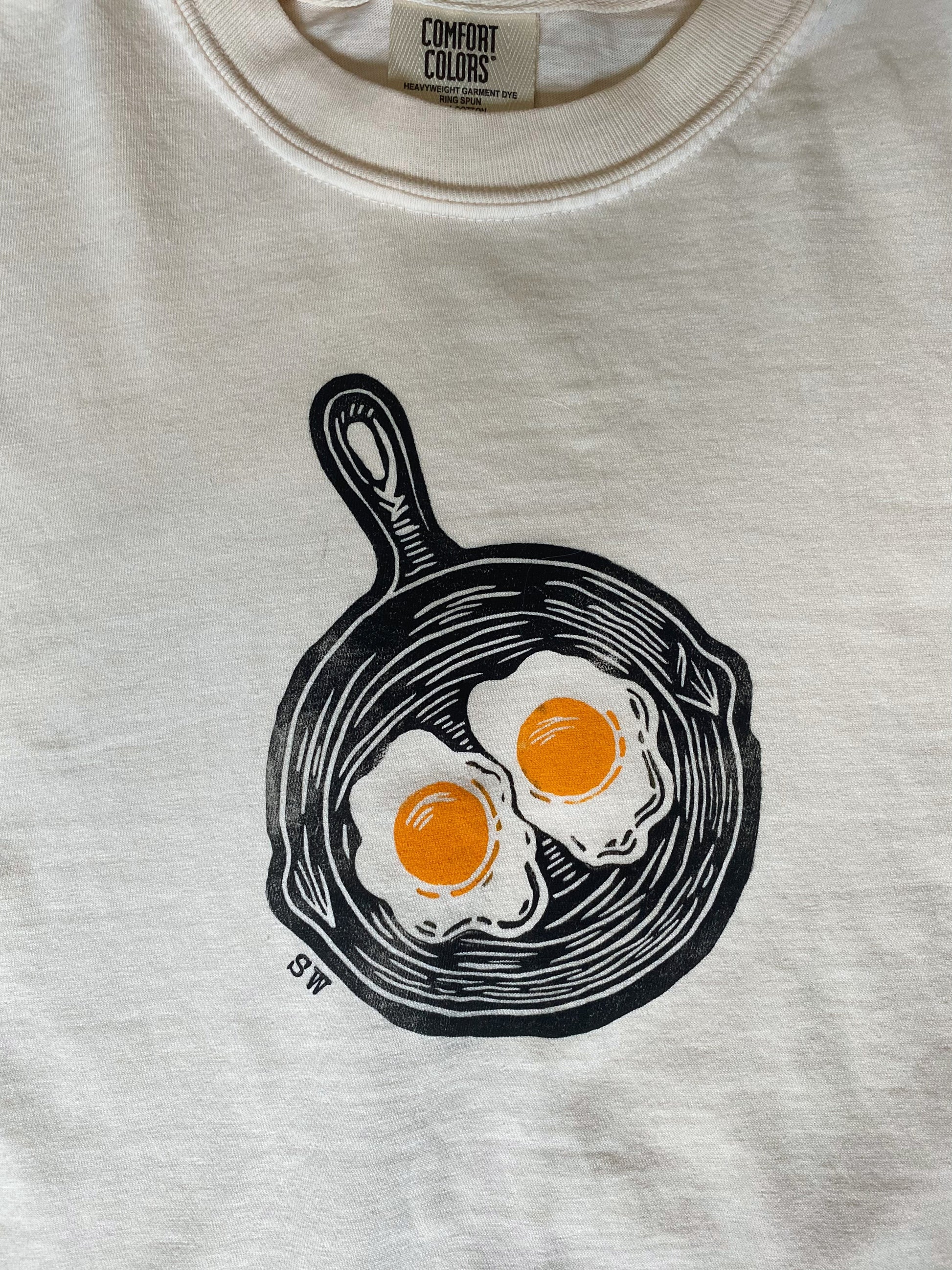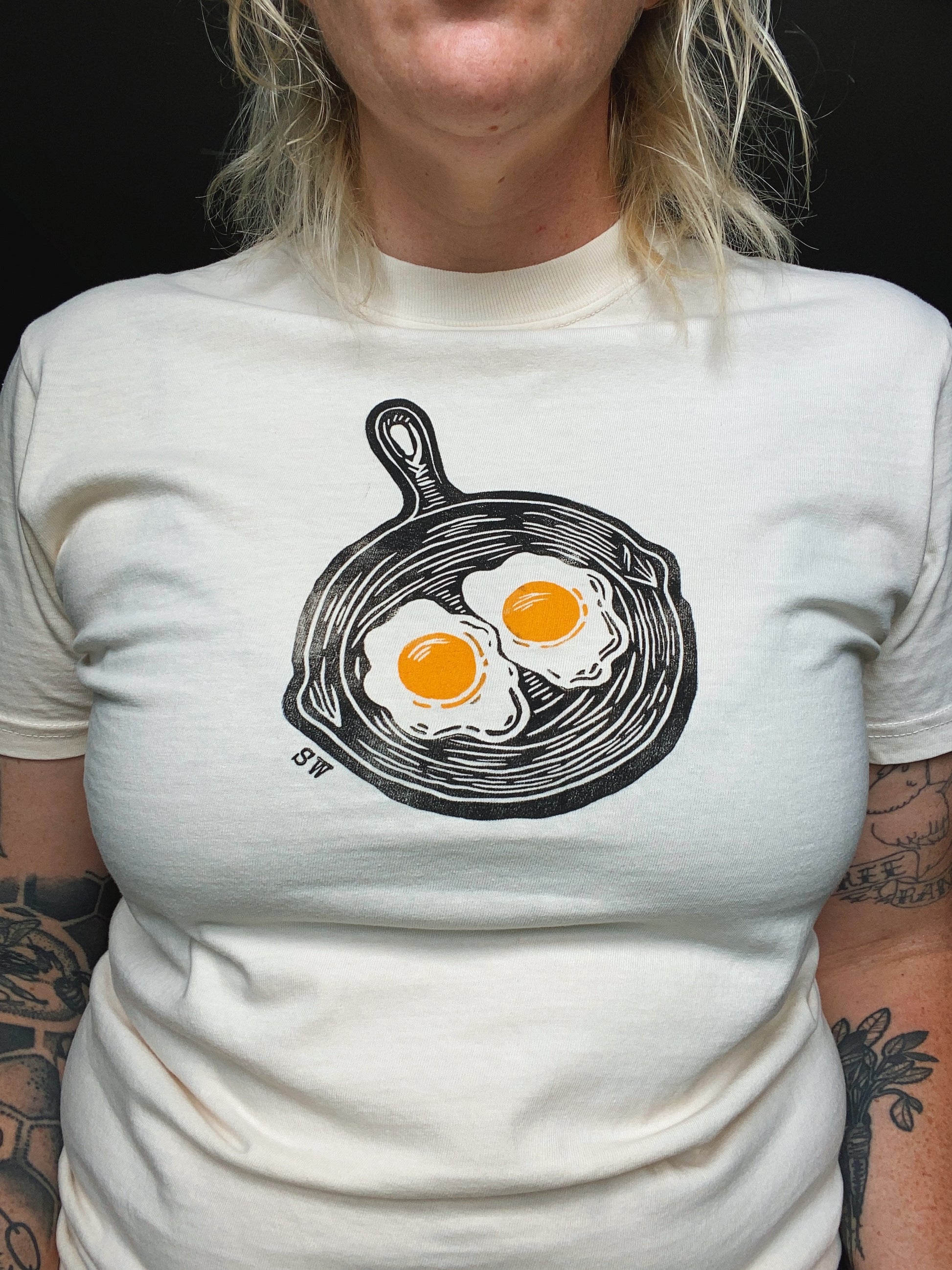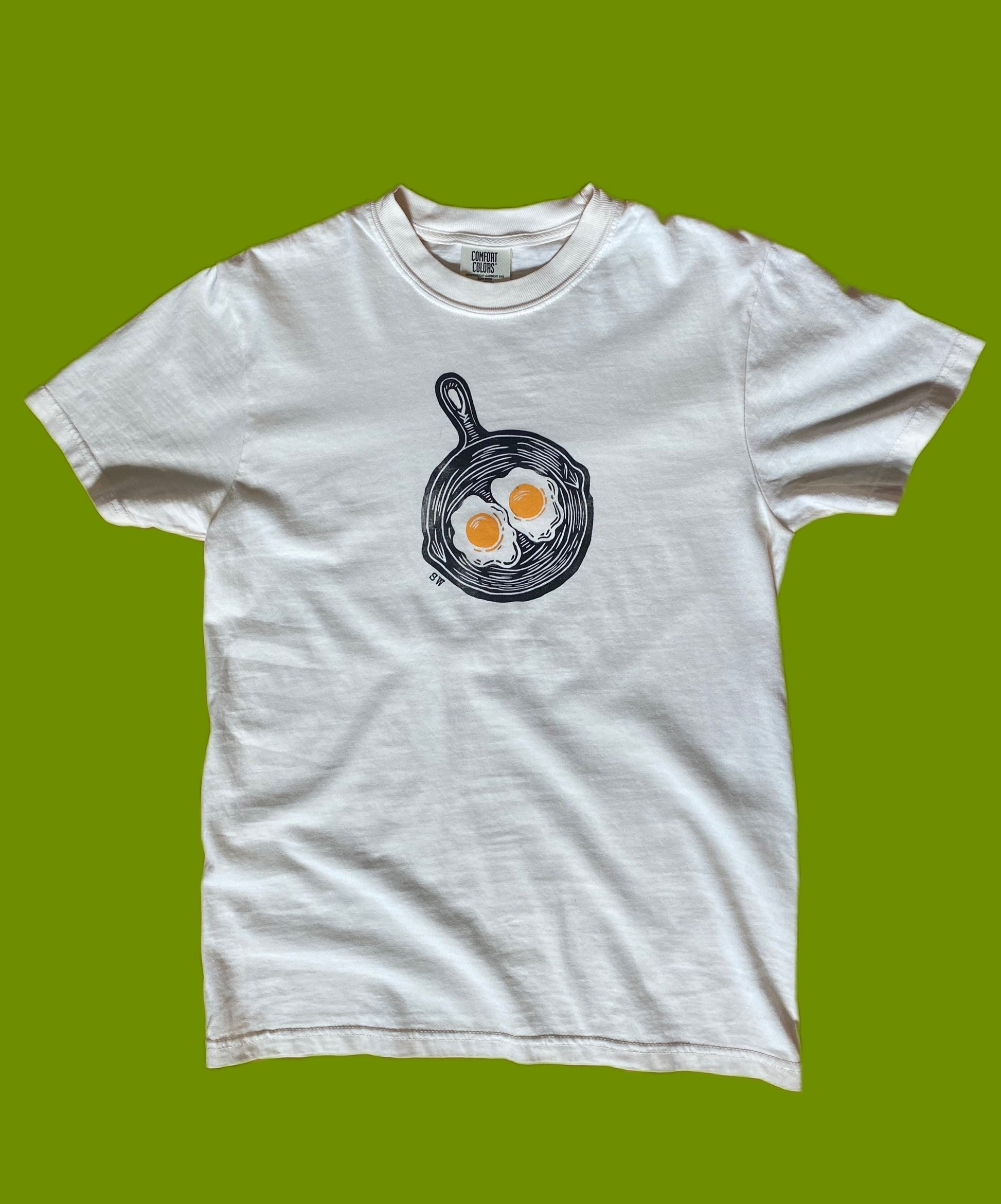 Start your day sunny side up! This hand printed t-shirt features a hand carved skillet design with two bright, happy eggs. Perfect for cast iron lovers, breakfast enthusiasts, or anyone who appreciates a good golden yolk.