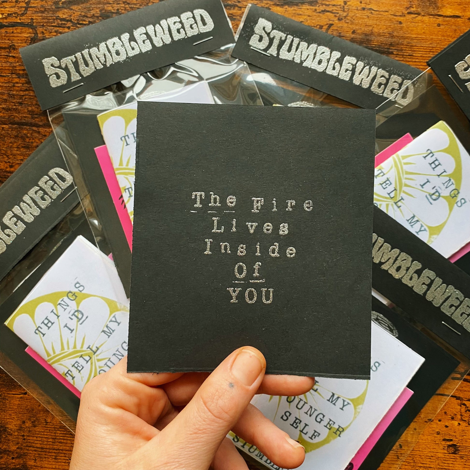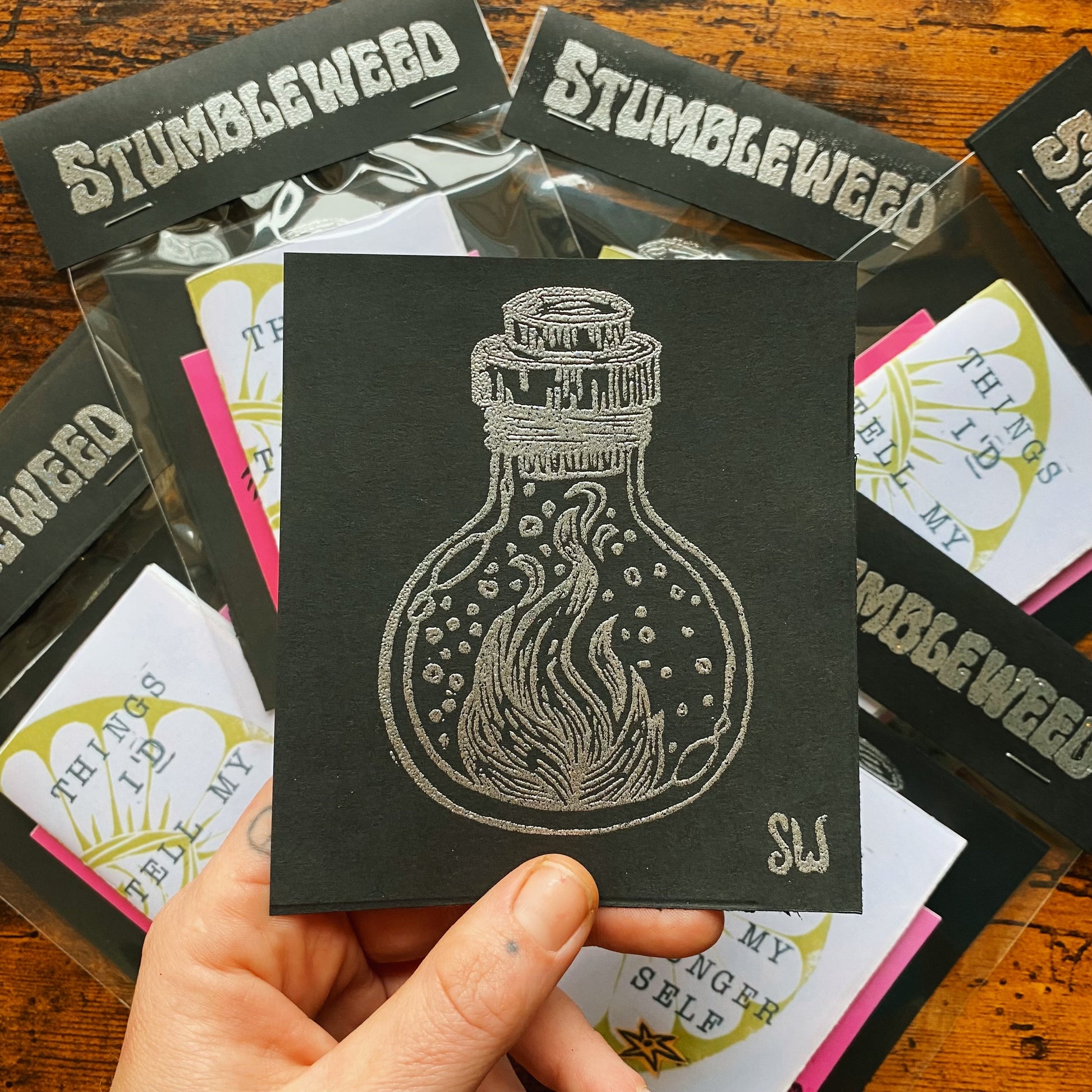 - Mini-linocut print featuring a heat embossed design on black cardstock. mini-print measures 4 1/2 x 4 in. The front design features a silver bottle holding flames, and The Fire Lives Inside Of You on the back.